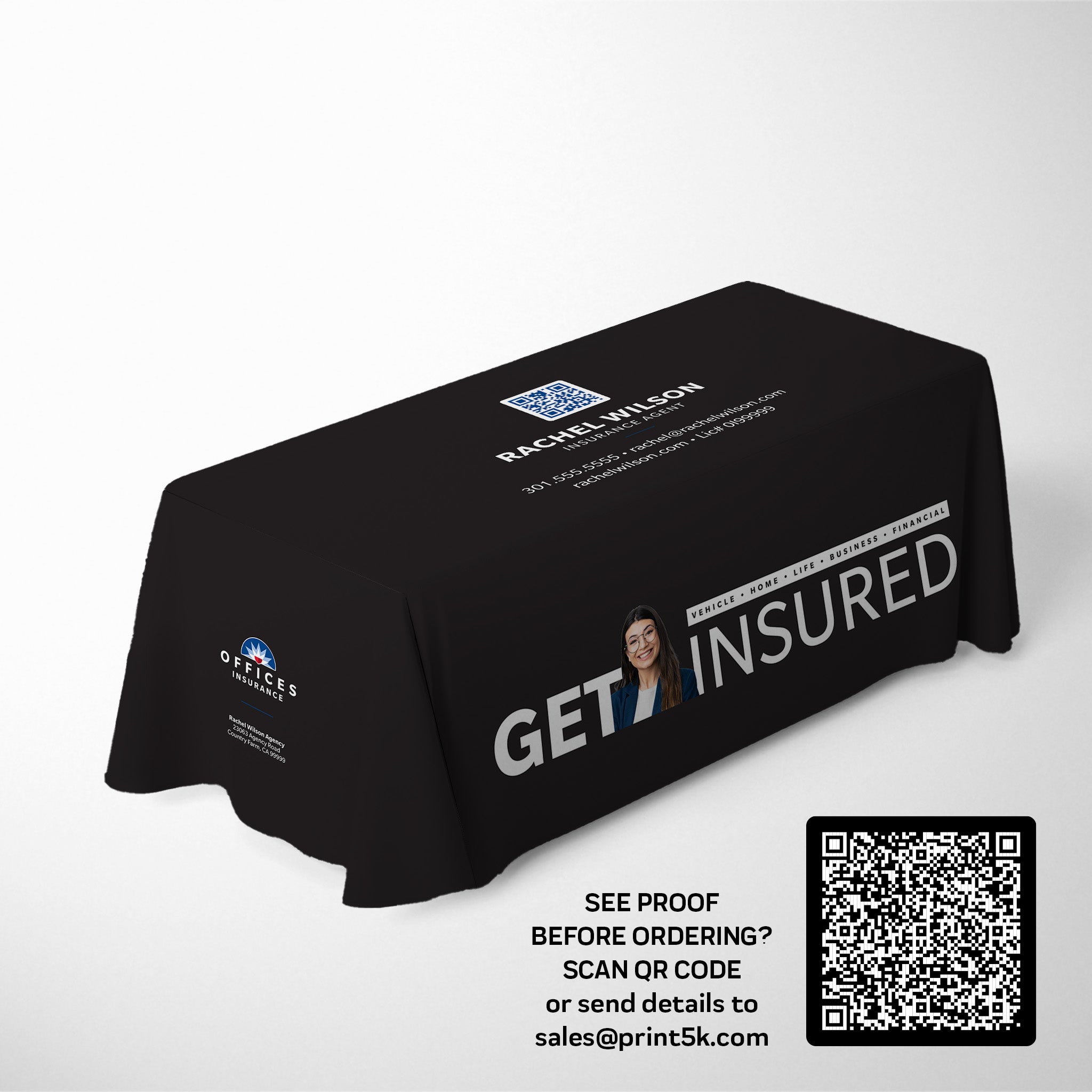 "Farmers Insurance logo used in the mockup is not the official logo, please send us the logo you want to use and a proof will be sent in 24/48hrs.