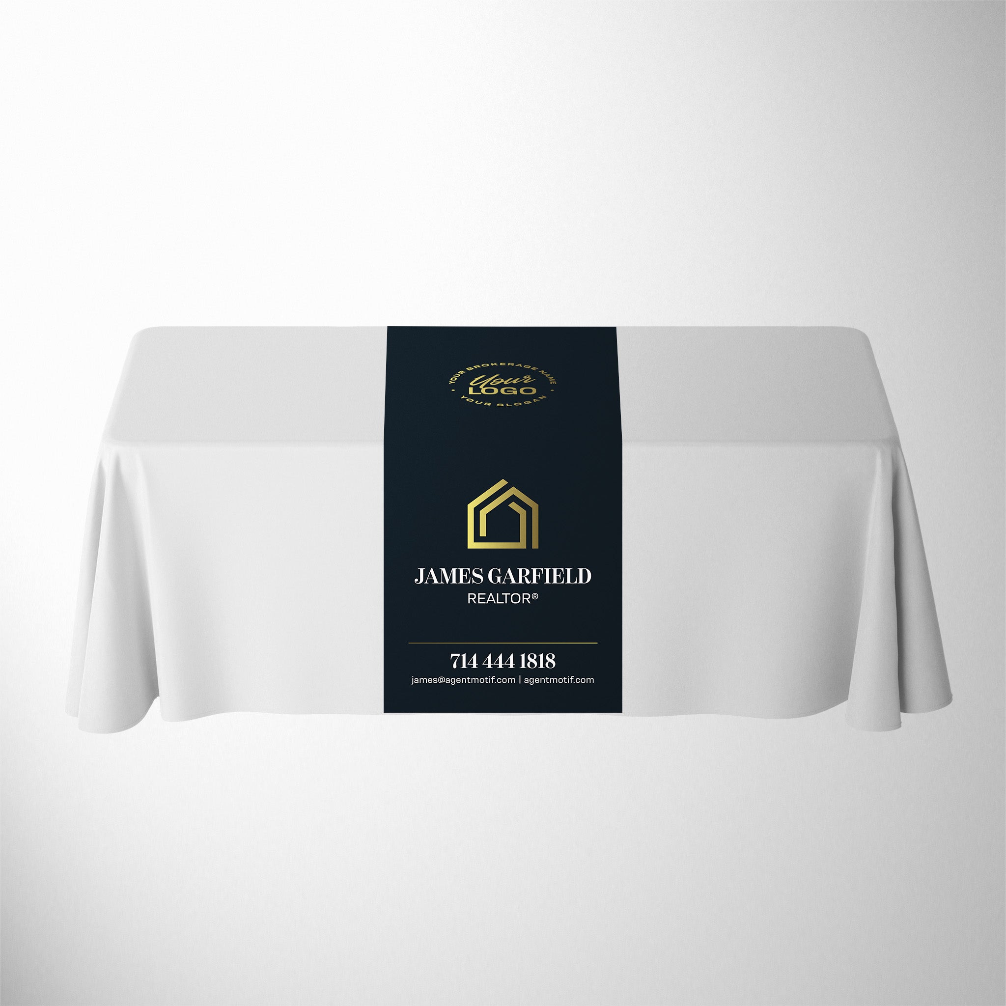 Personalized Table Runner will add a finished professional look to any table display, trade show booth, or special event/showing. Add your brokerage logo, name, title and even your personal logo! We can also change the color from black to your color of choice., just let us know! Custom printed edge-to-edge, the full length material will cover the front, back and both sides of the table. Our table runners are custom printed and are available in 2ft, 3ft, 4ft, and 5ft widths. We offer them in full drape to match your existing table throws.